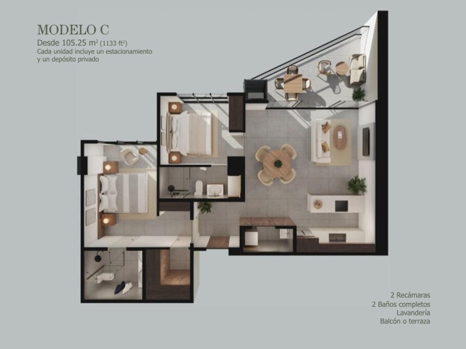 2 recámaras · 2 baños completos · lavandería · balcón o terraza