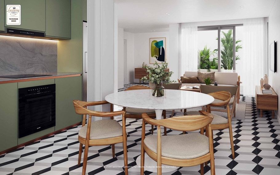 Acabados Premium: Pisos de azulejo artesanal hidráulico y materiales que honran la estética histórica.