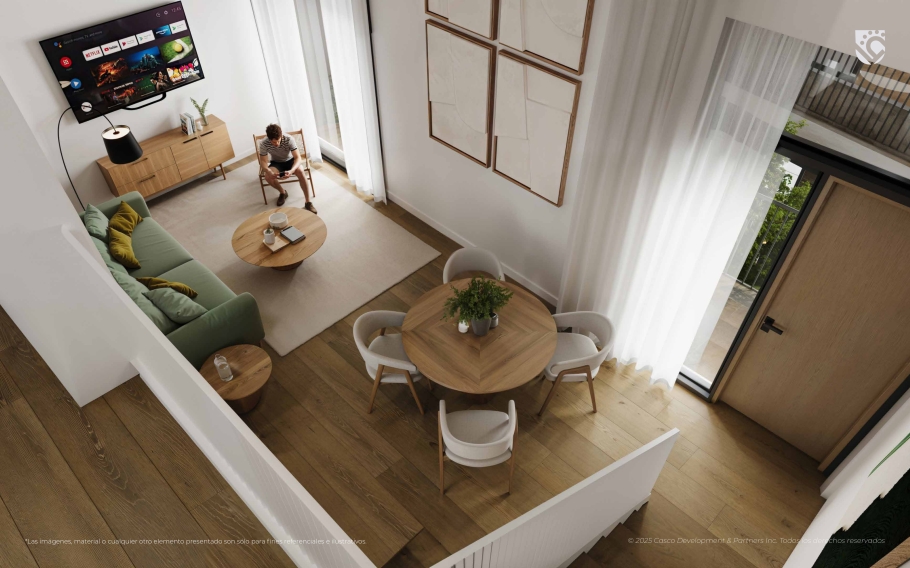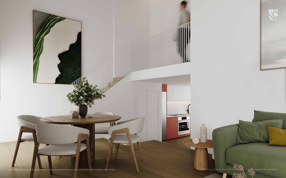 Espacios Exteriores: Cuenta con balcón privado y acceso a un mezzanine en el nivel superior.