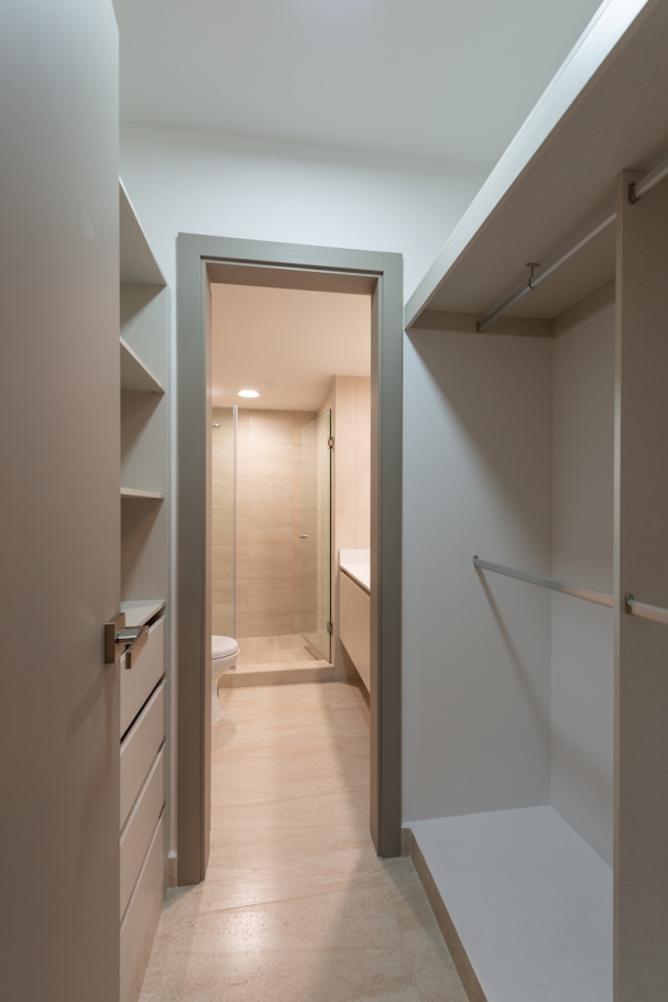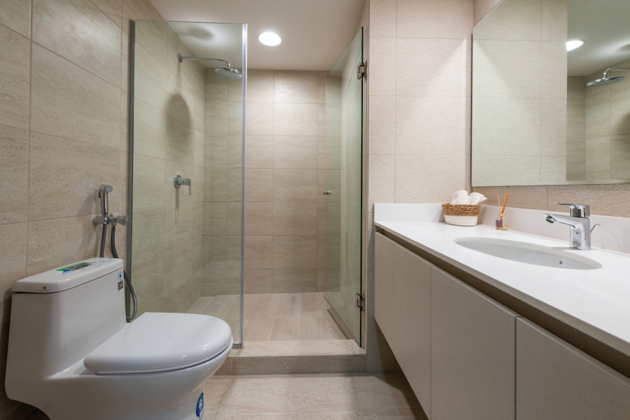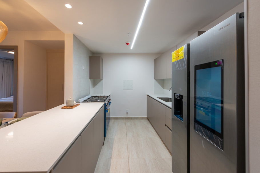 Acabados de Alta Calidad: Incluyen sobres de cuarzo, grifería GROHE, lavamanos Franz Viegenr, fregaderos MOEN y ventanas de vidrio templado.